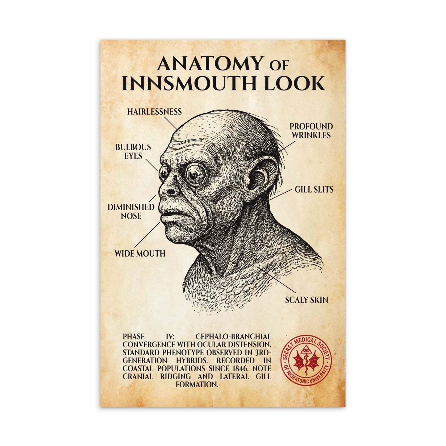 Diese anatomische Tafel im Vintage-Stil präsentiert eine medizinische Analyse des berüchtigten „Innsmouth-Blicks“ – der verräterischen Merkmale der Deep One-Hybridisierung. Mit gekennzeichneten Merkmalen wie Augenerweiterung, Schädelwülsten und ausgeprägten Kiemenspalten erinnert die Illustration an verbotene Forschung aus den Archiven der Miskatonic University. Eine Mischung aus anatomischer Präzision und okkulter Suggestion – eine erschreckende Hommage an die Lovecraftsche Transformation.