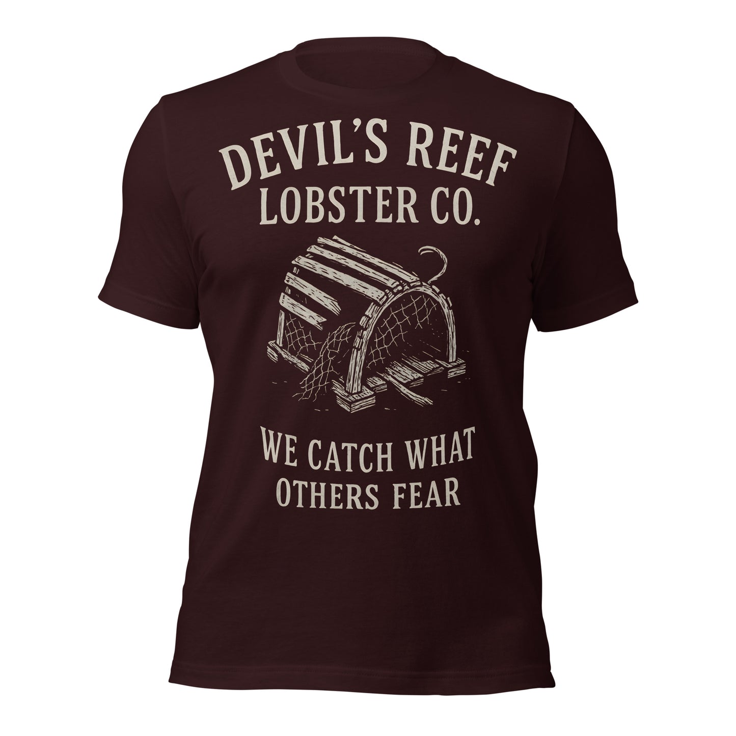 Dieses T-Shirt-Design im Used-Look für Devil's Reef Lobster Co. zeigt eine kaputte Hummerfalle – zerrissen, verdreht und von etwas nicht ganz Natürlichem aufgerissen.