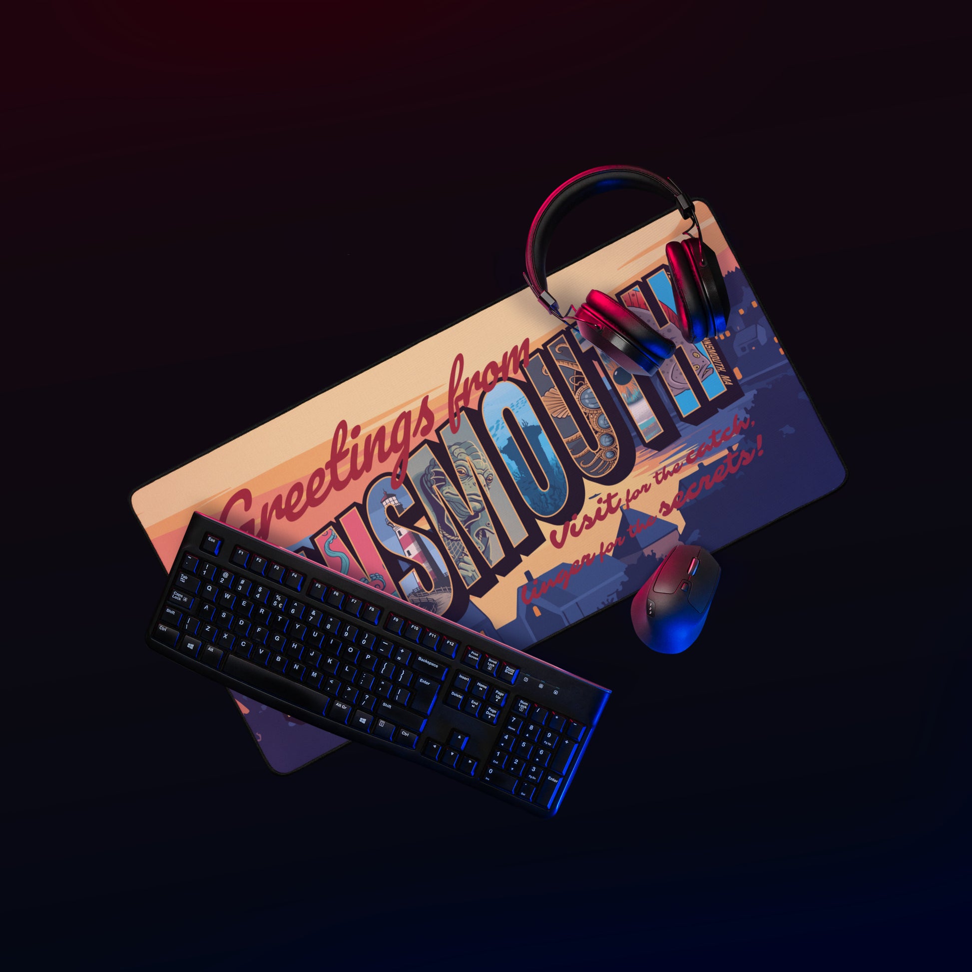 Ein großformatiges Reiseposter mit dem Titel „Grüße aus Innsmouth“ zeigt im Retro-Stil eingelegte Szenen von Küsten, Leuchttürmen und Fischern mit subtilen, beunruhigenden Lovecraft-Motiven. Flache Farben, kräftige Silhouetten und Halbtontexturen erinnern an eine nostalgische Postkartenästhetik. Das Design verbindet klassische Küstentourismus-Bilder mit einem Unterton unheimlicher maritimer Bedrohung.