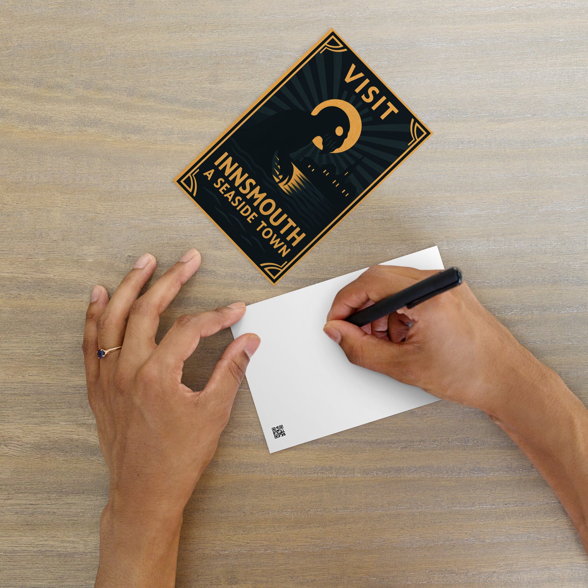 This Art Deco–inspired travel postcard captures the eerie beauty of Innsmouth under a glowing moon. Stylized shadows, geometric waves, and glowing silhouettes create an unsettling yet elegant atmosphere, evoking mystery, transformation, and the lure of the unknown. A sophisticated nod to Lovecraftian coastal horror.