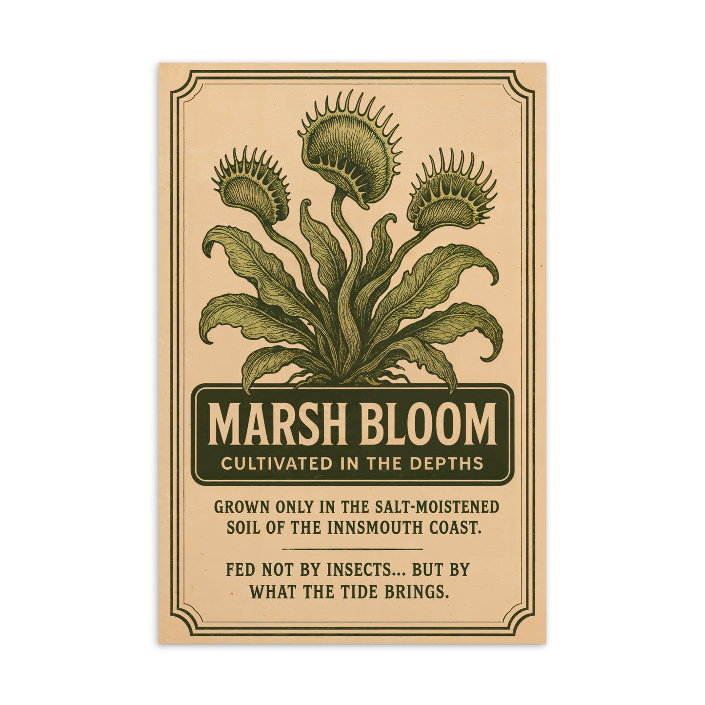 The Marsh Bloom is no ordinary plant—it thrives in the briny soil of the Innsmouth coast and feeds on what the tide delivers. This vintage botanical illustration captures the haunting beauty of this abyssal species, born from salt, shadow, and secrets best left buried.